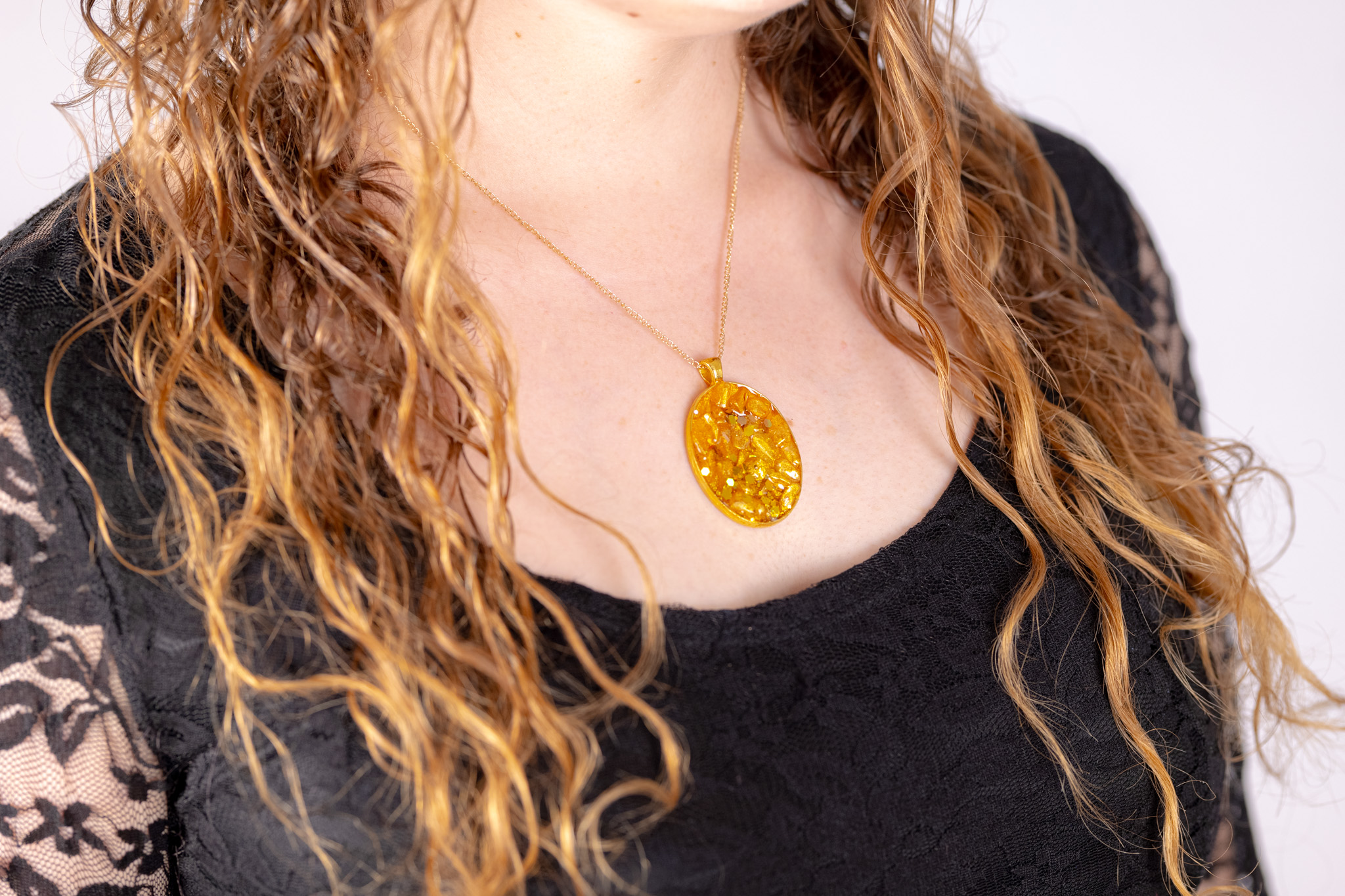 Prana Amulett enthält neben den Kraftsteinen Citrin, Bernstein, Bergkristall, Messing, Kupfer und Gold