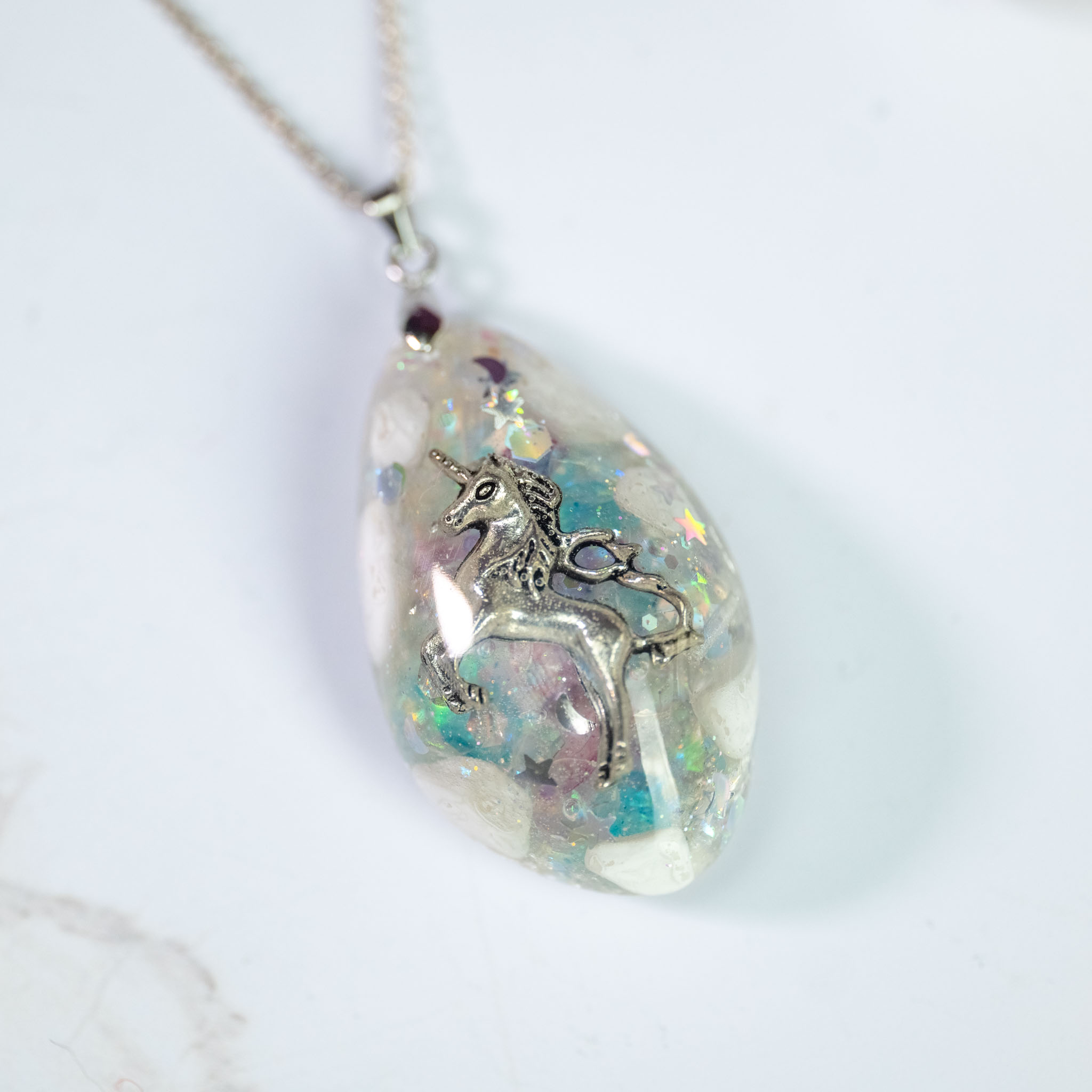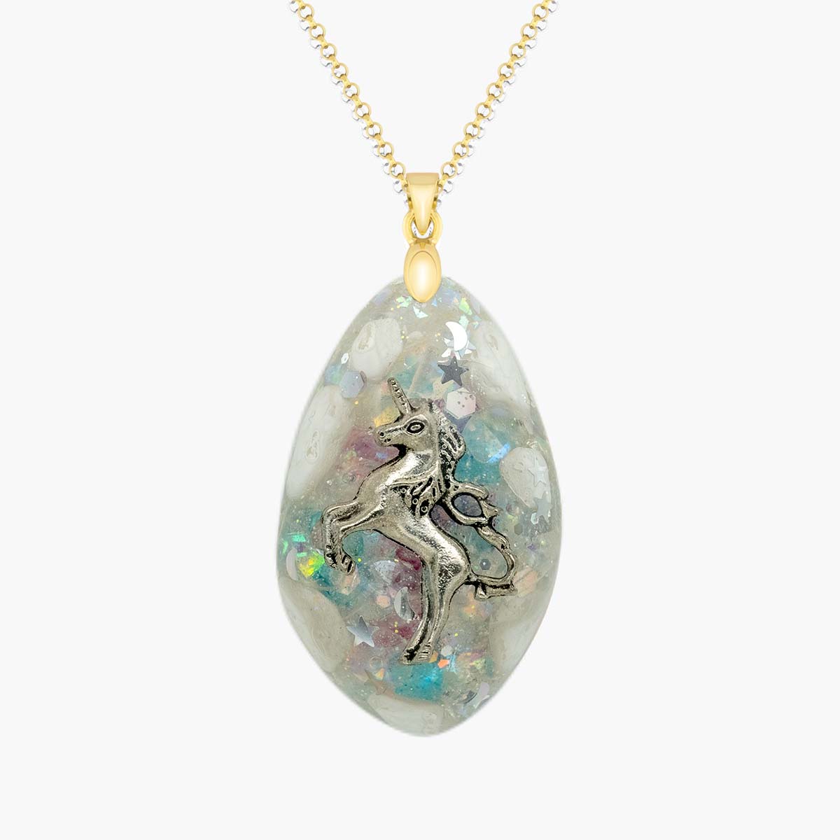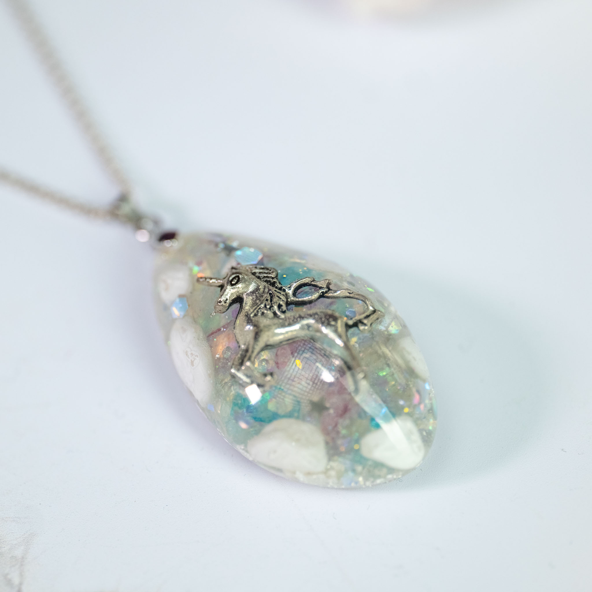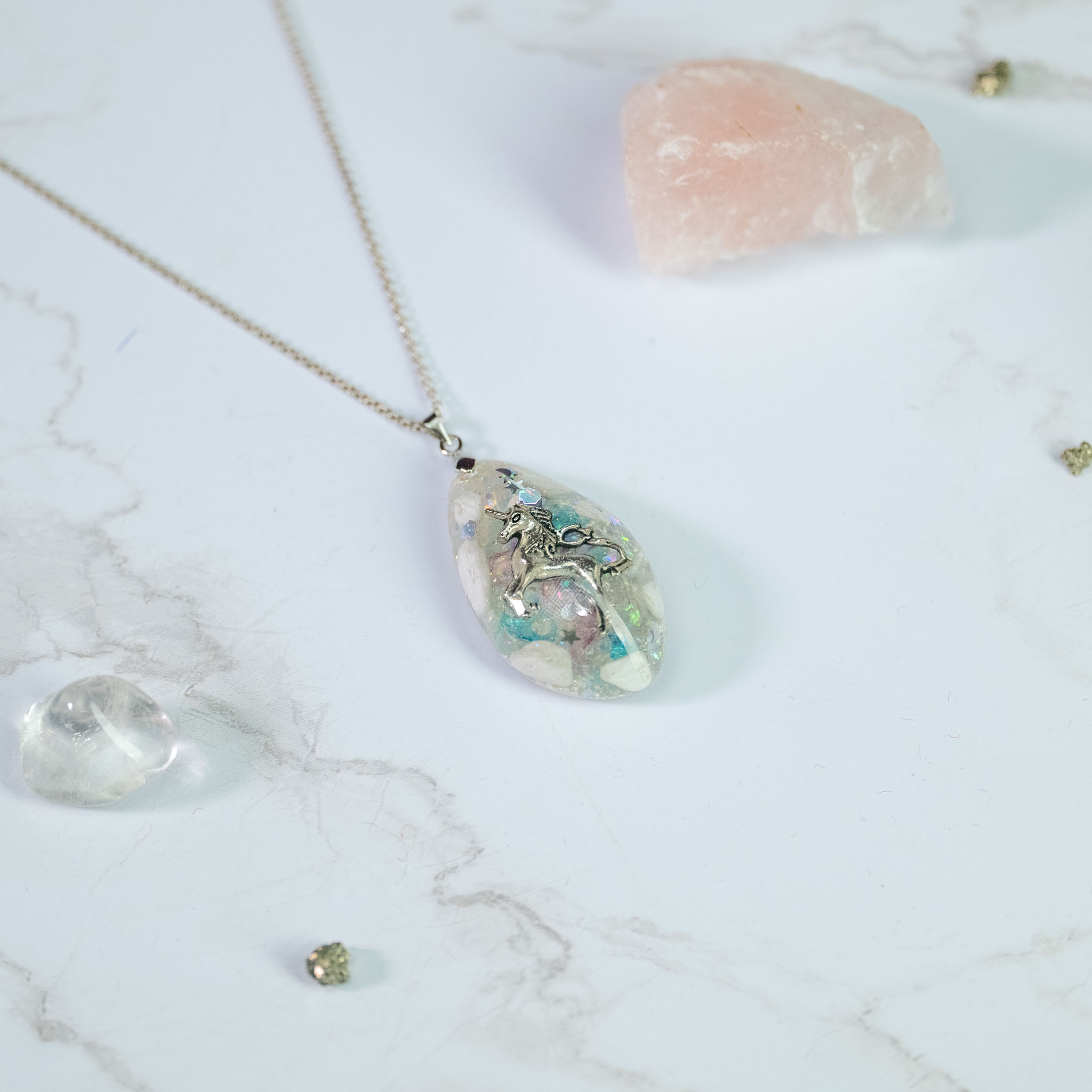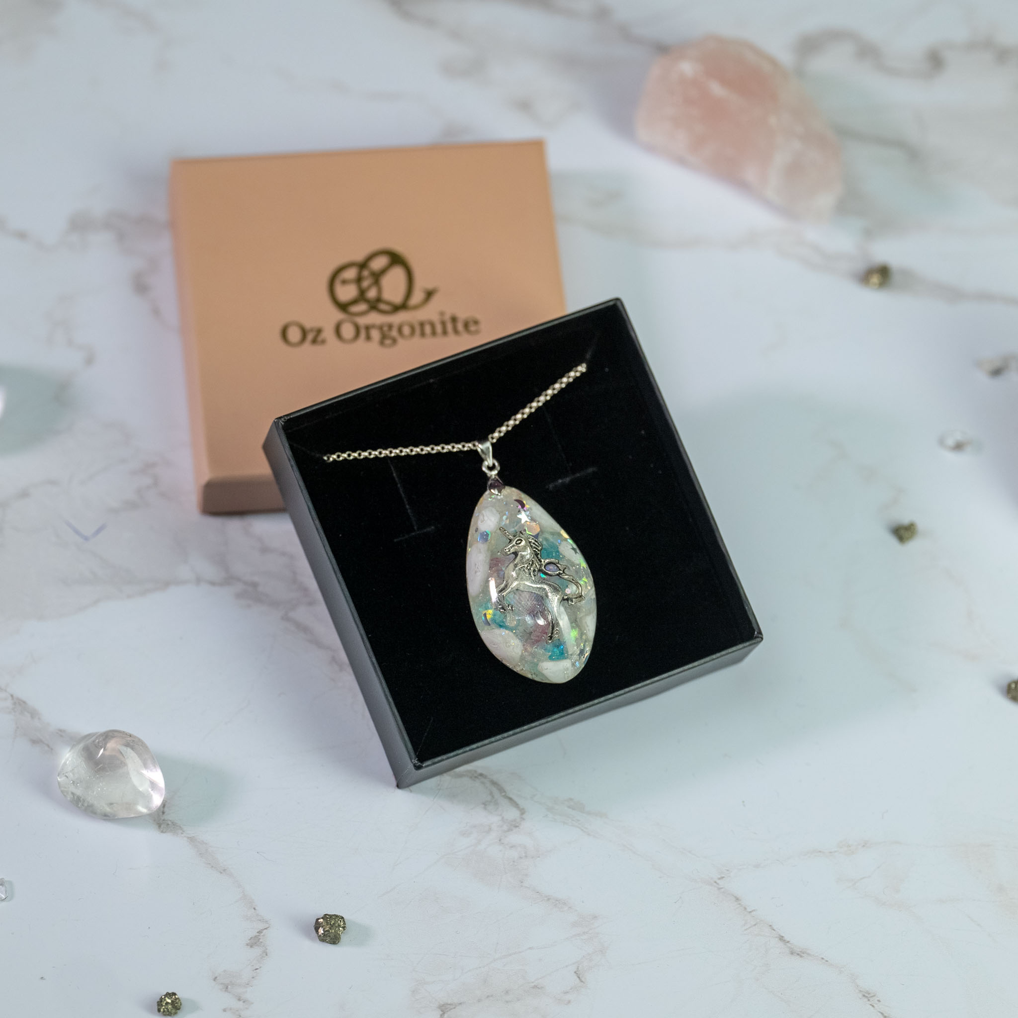 Ein liebevolles, magisches Wesen erwartet dich tief im Wald. Das Einhorn bringt mit seinem strahlend weißen Energiestrahl Licht, Reinheit und Hoffnung und symbolisiert die harmonische Verbindung zwischen dem Feenreich und der materiellen Welt. Dieser Pranatropfen fängt die Essenz des Einhorns in einer zauberhaften Anhängerform ein, in der Kristalle und Metalle eine magische Energie erschaffen, die Körper, Geist und Seele nährt.