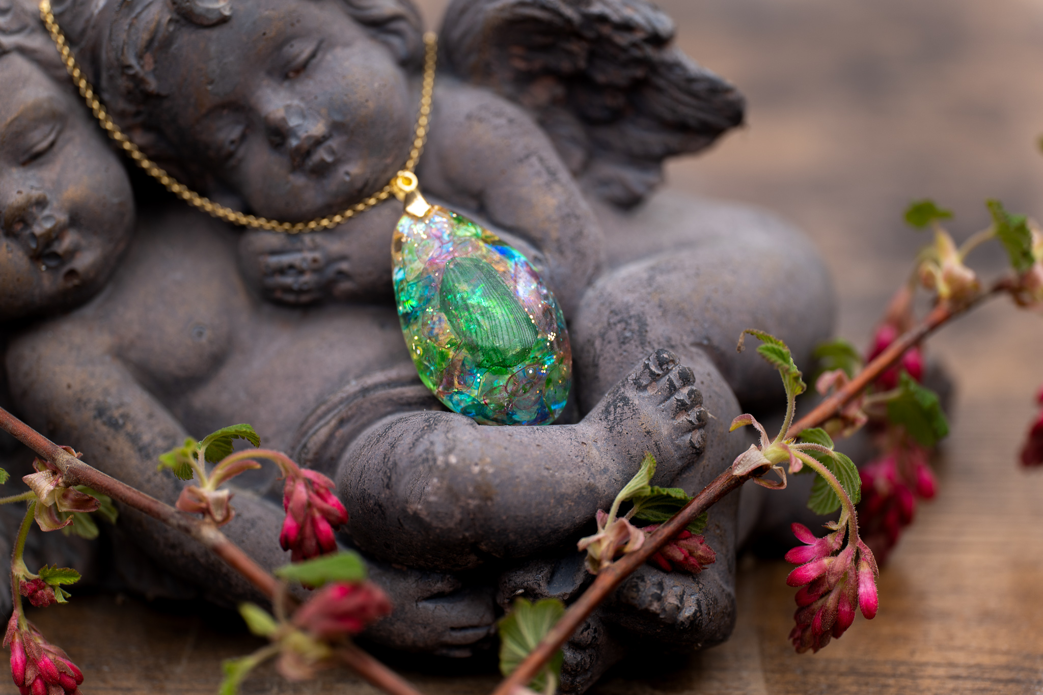 Pranatropfen® bestehen aus Kunstharz, Edelsteinen, Edelmetallen und wurden in einem mehrschichtigen Gießverfahren in der Oz-Werkstatt produziert. Alle Oz-Produkte unterliegen strengen Qualitätsrichtlinien. Pranatropfen, wie alle Oz-Produkte, werden in Handarbeit gefertigt und sind deshalb Unikate. Es können daher leichte Abweichungen in Beschaffenheit und Aussehen zu den Produktbildern existieren. Jeder Pranatropfen kommt mit einer Collierschlaufe in wahlweise Gold oder Silber, sowie einem farblich passenden Seidenband und einem hochwertigen Etui zur Aufbewahrung.