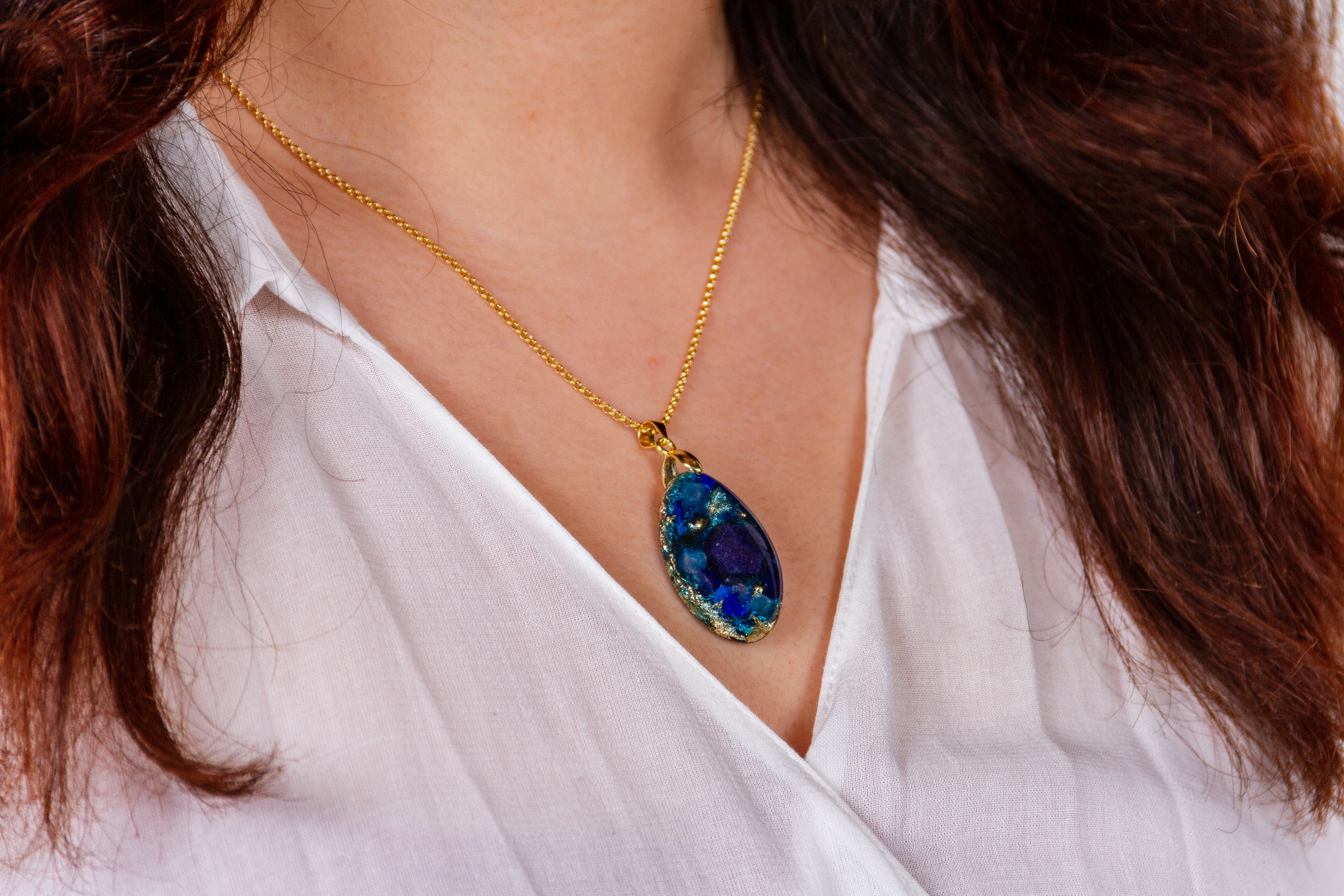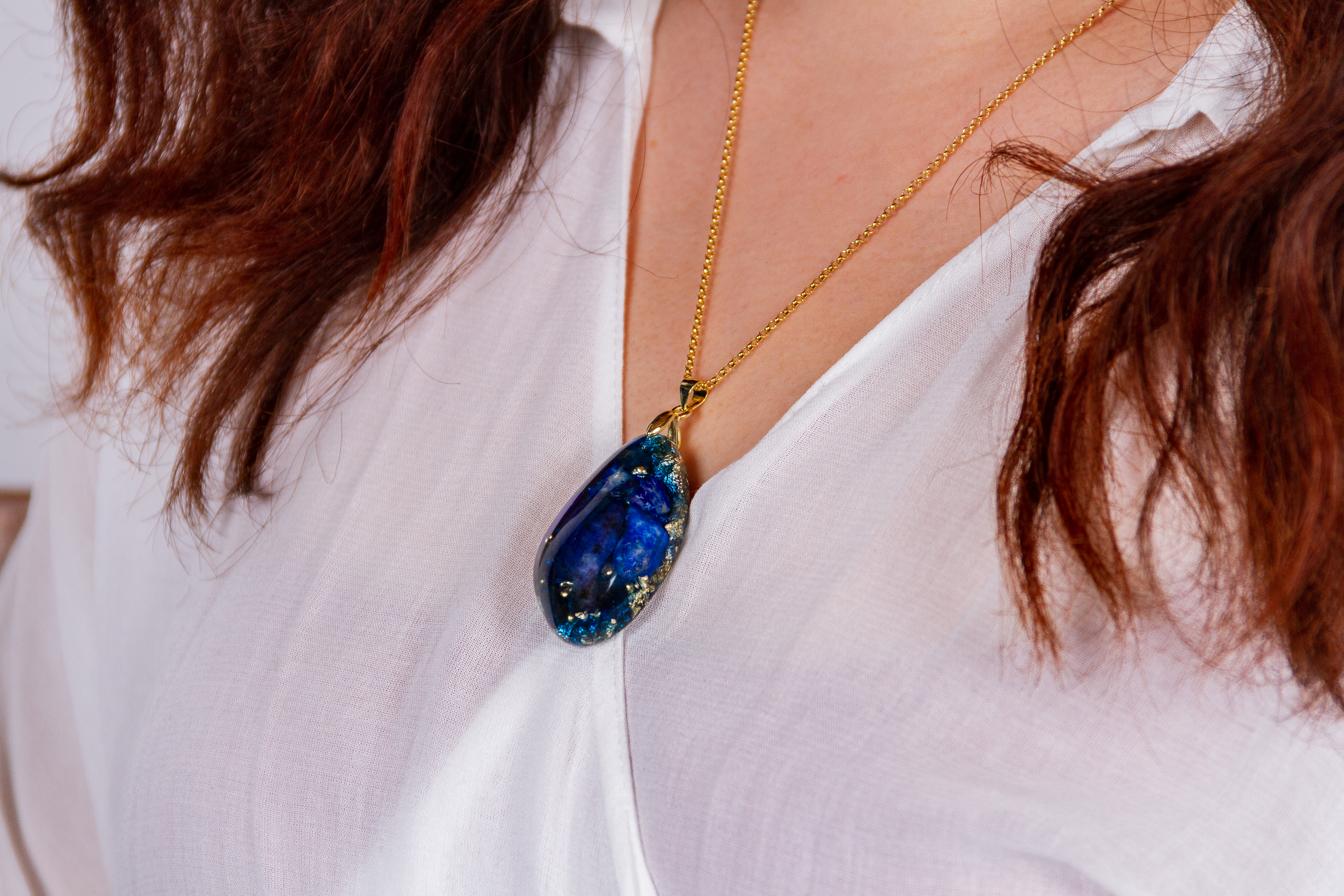 Der Schwingung des Erzengel Michael zugeordnet, ist Saphir in der Mitte des Anhängers platziert, ummantelt von Azurit und Lapis Lazuli. Seine blaue Farbe und seine spezielle Edelsteinkombination stehen für Schutz und Mut.