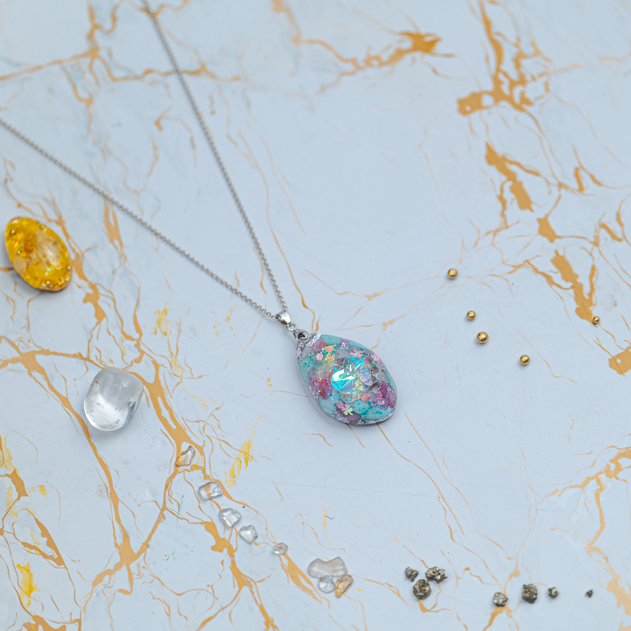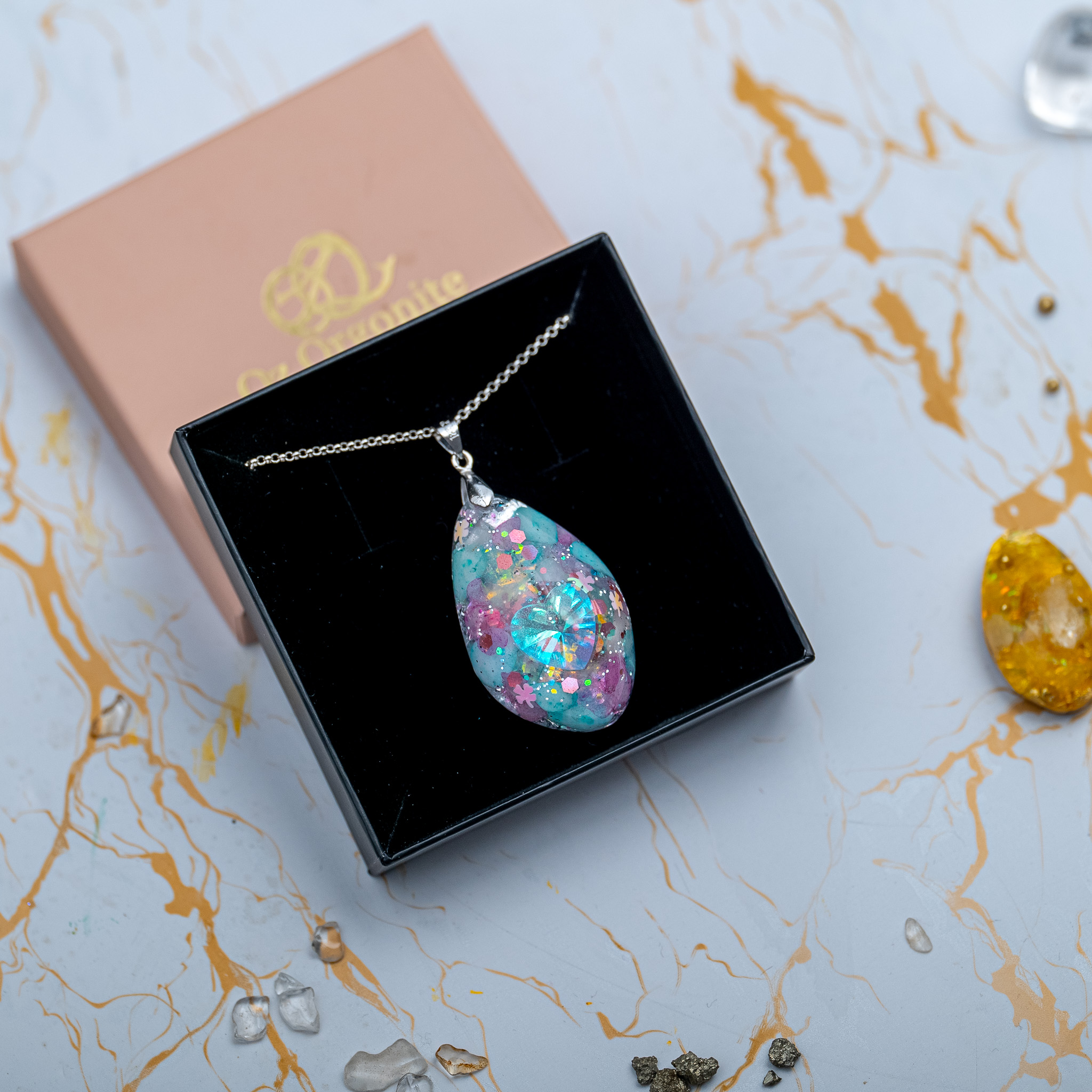 Pranatropfen® bestehen aus Kunstharz, Edelsteinen, Edelmetallen und wurden in einem mehrschichtigen Gießverfahren in der Oz-Werkstatt produziert. Alle Oz-Produkte unterliegen strengen Qualitätsrichtlinien. Pranatropfen, wie alle Oz-Produkte, werden in Handarbeit gefertigt und sind deshalb Unikate. Es können daher leichte Abweichungen in Beschaffenheit und Aussehen zu den Produktbildern existieren. Jeder Pranatropfen kommt mit einer Collierschlaufe in wahlweise Gold oder Silber, sowie einem hochwertigen Etui zur Aufbewahrung.