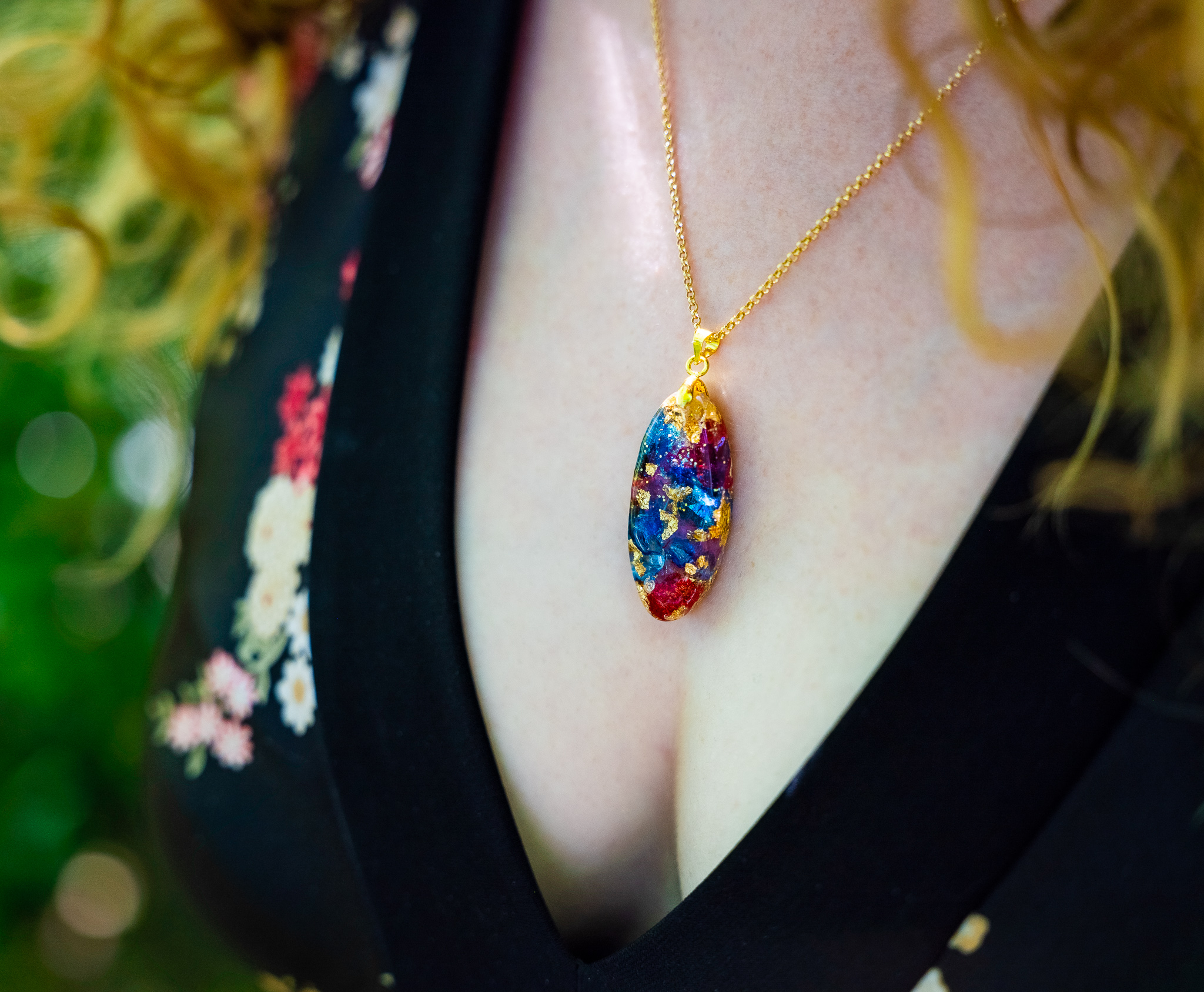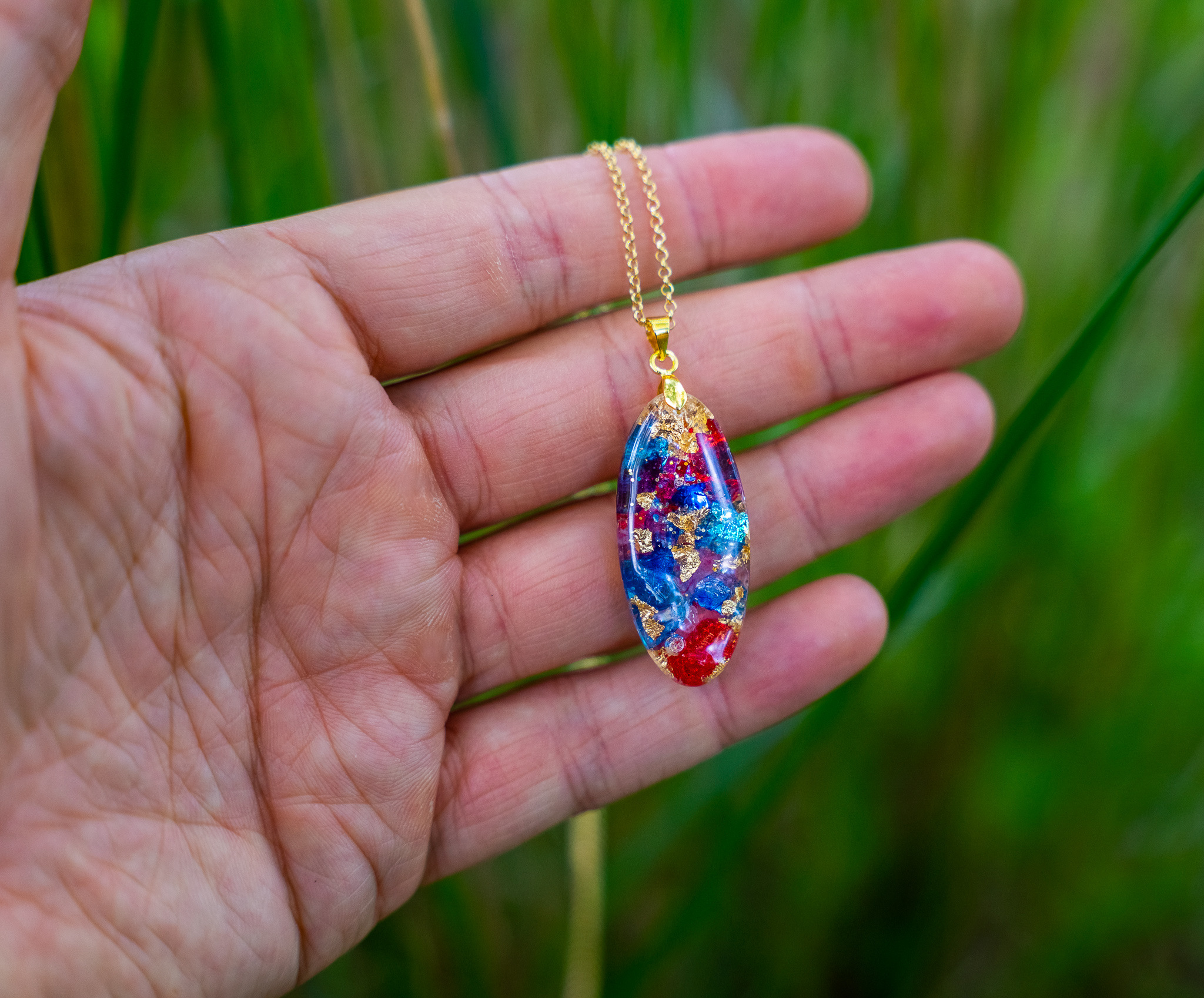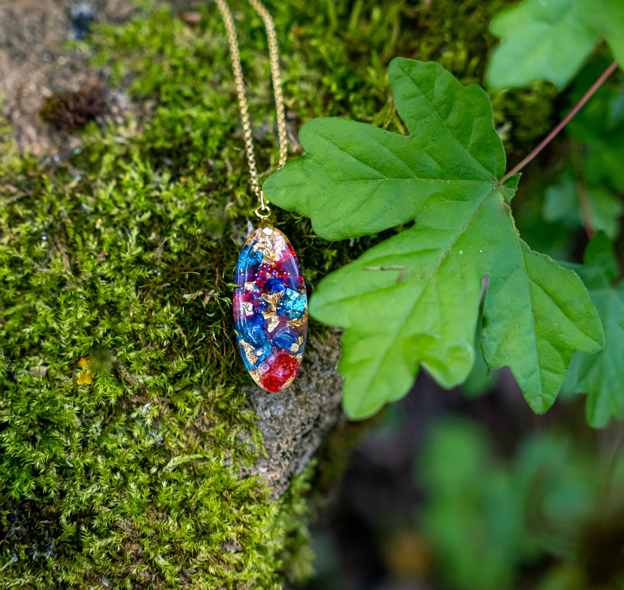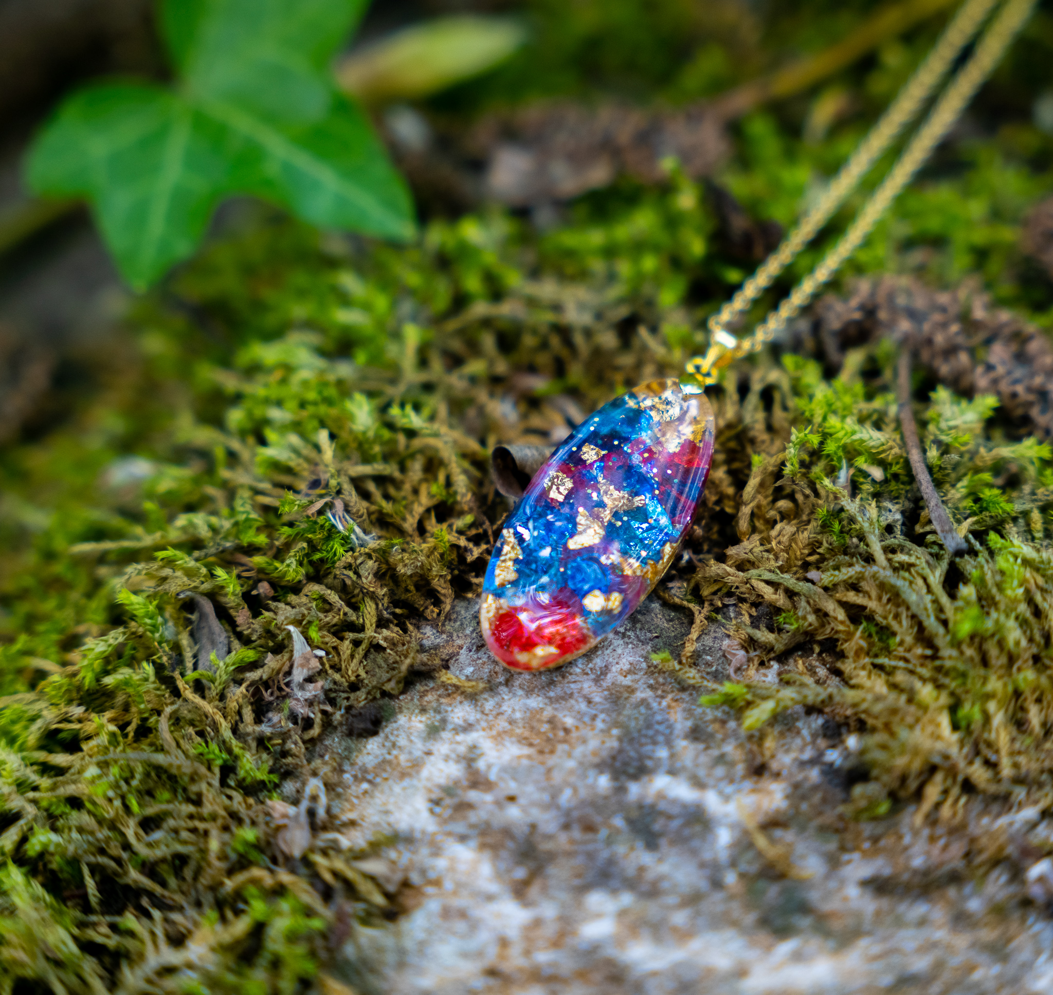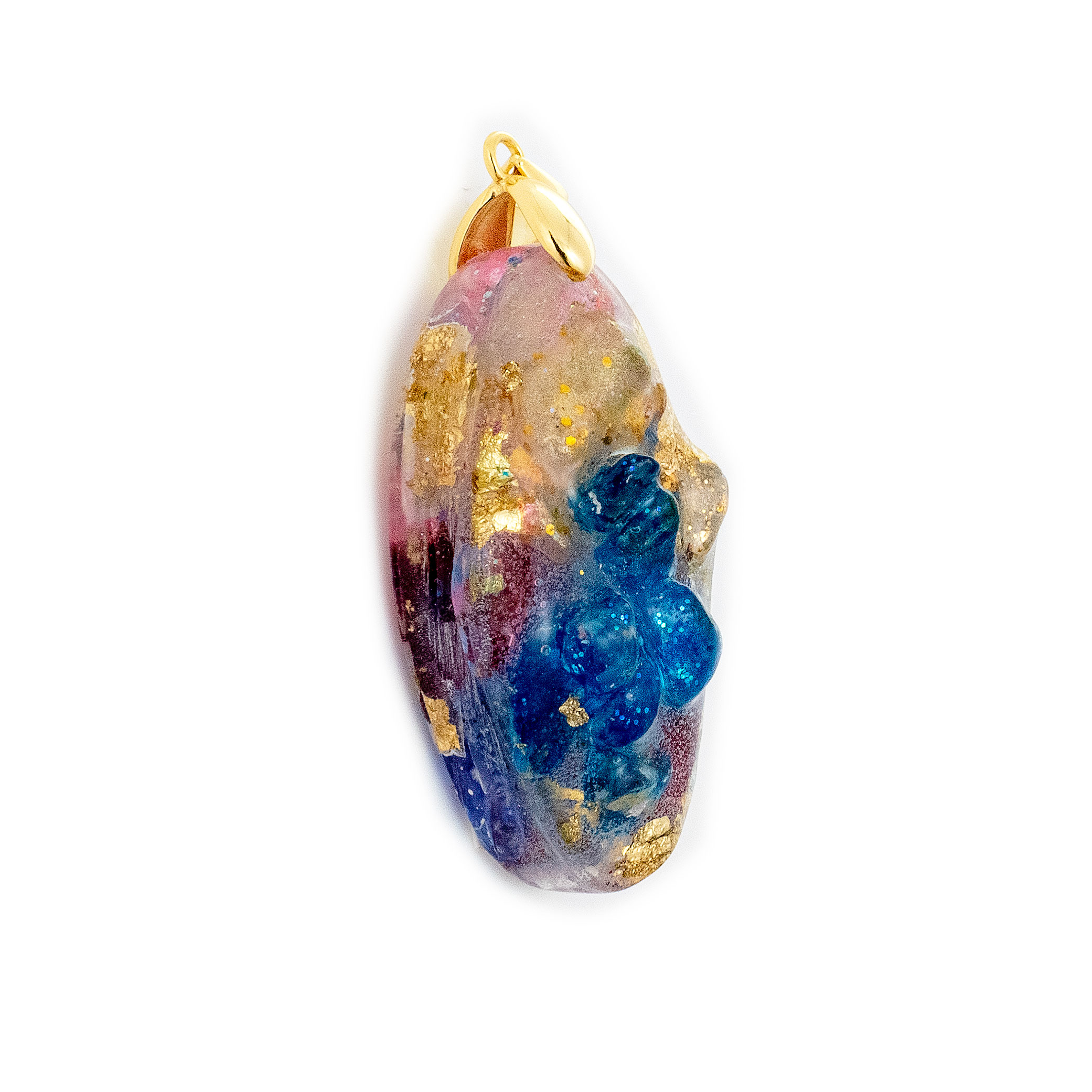 PranaAmulett Stärke - Limited besitzt den alchemistisch, aufgeladenen Edelstein Bergkristall. Seine blau, lila Farbe und Goldakzente stehen für Intuition, Schutz und Mut.